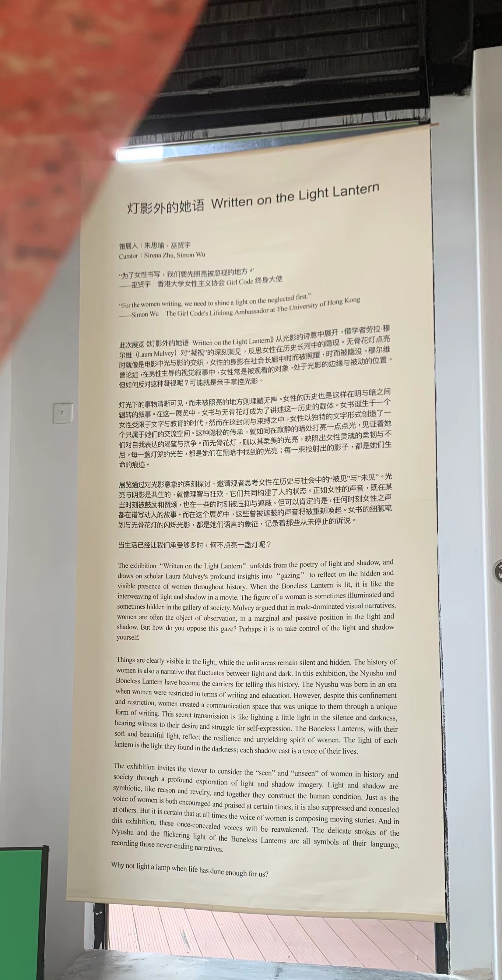 展覽通過對光影意象的深刻探討,邀請觀者思考女性在歷史與社會中的“被見”與“未見”。光亮與陰影是共生的,就像理智與狂歡,它們共同構建了人的狀態。正如女性的聲音,既在某些時刻被鼓勵和讚頌,也在一些的時刻被壓抑與遮蔽。但可以肯定的是,任何時刻女性之聲都在譜寫動人的故事。而在這個展覽中,這些曾被遮蔽的聲音將被重新喚起。女書的細膩筆劃與無骨花燈的閃爍光影,都是她們語言的象徵,記錄著那些從未停止的訴說。